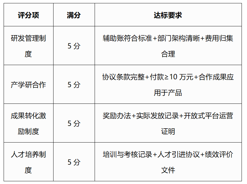 研发组织管理水平评分强调“制度完整性”与“执行真实性”。企业需系统性整理四类制度文件,并通过付款凭证、会议记录、考核文件等形成完整证据链,避免因“有制度无执行”或“有合作无成果”导致扣分。