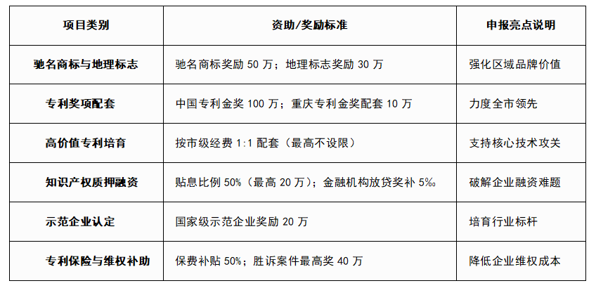 为深入实施知识产权强区战略,九龙坡区市场监督管理局正式发布《2024年度知识产权资助及奖励项目申报通知》。本次政策面向全区企事业单位及社会团体(不含高新区直管园),重点支持高价值专利培育、知识产权质押融资、示范企业认定等创新领域,单项目最高奖励达50万元。企业主可通过系统化申报流程获取资金扶持,全面提升知识产权创造、运用与保护能力。